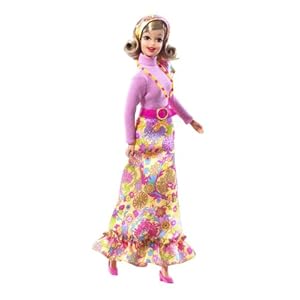 Shop Smarter and Save Money on Barbie Collector # N5012 Becky. Meet Becky, a slightly familiar face from another time and place. Appropriately attired in a 70s-inspired bright yellow party dress, Becky doll wears terrific period makeup with robin's egg blue eyeliner over her eyes and a soft shade of pink lipstick. Two additional fashions accompany the doll. The first includes a pink turtleneck, long flowing floral patterned skirt, matching headscarf, and beaded necklace. The second fashion features a lovely pink pantsuit with matching vest, floral top, and pink headband complete the package. Doll has bendable legs, twist 'n turn waist, and rooted eyelashes.