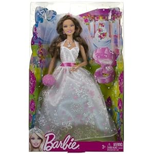 The best place to read user reviews Dark Brown Hair: Barbie Bride Fairytale ~11" Doll Series. Discover Barbie Fairytale Magic with the Teresa Bride doll. Every princess dreams of the day she will marry her prince. Girls can play out their wedding-day dreams with this beautiful bride wearing an exquisite wedding dress. The gown has sparkles to capture the light and pink accents for a Barbie twist. The matrimonial outfit is completed with jewelry, including a ring and flower bouquet. A ring for the girl adds an extra dimension to role-play.