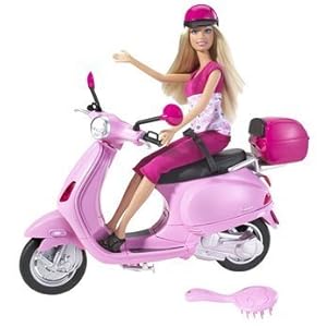 The best place to read user reviews Barbie Pink Vespa and Doll.. Help Barbie on her travels with this pink Vespa bike. Your Barbie doll can nip around town in style on this pretty pink moped!Barbie comes dresses in a cute pink outfit, and includes a pink crash helmet, and hairbrush.