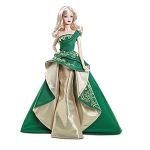 The best place to read user reviews Barbie Collector 2011 Holiday Doll. Celebrate the holiday season in style with the Barbie Collector 2011 Holiday Doll. Dressed in an opulent emerald gown featuring elegant gold embroidery, Barbie is ready for holiday balls and festivities. Ideal for the adult collector, but suitable for children six and up, this special-occasion Barbie's fabulous dress and accessories will give your collection a festive touch. Elegant and Contemporary Look for Holiday 2011 This glamorous Barbie is ready to attend the winter ball in her floor-length emerald gown with slim golden lame underskirt, intricate gold embroidery, and sparkling jewel accents. The gown features a strapless bodice with a stylish, one-shoulder wrap. Completing the look are gold open-toed heels, glamorous gold chandelier earrings, and sparkly gold eye shadow. Barbie's festive ensemble features dazzling detail--elegantly styled long golden curls, flawless makeup, and an impeccable manicure.